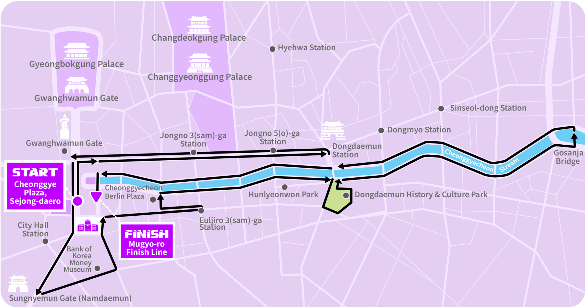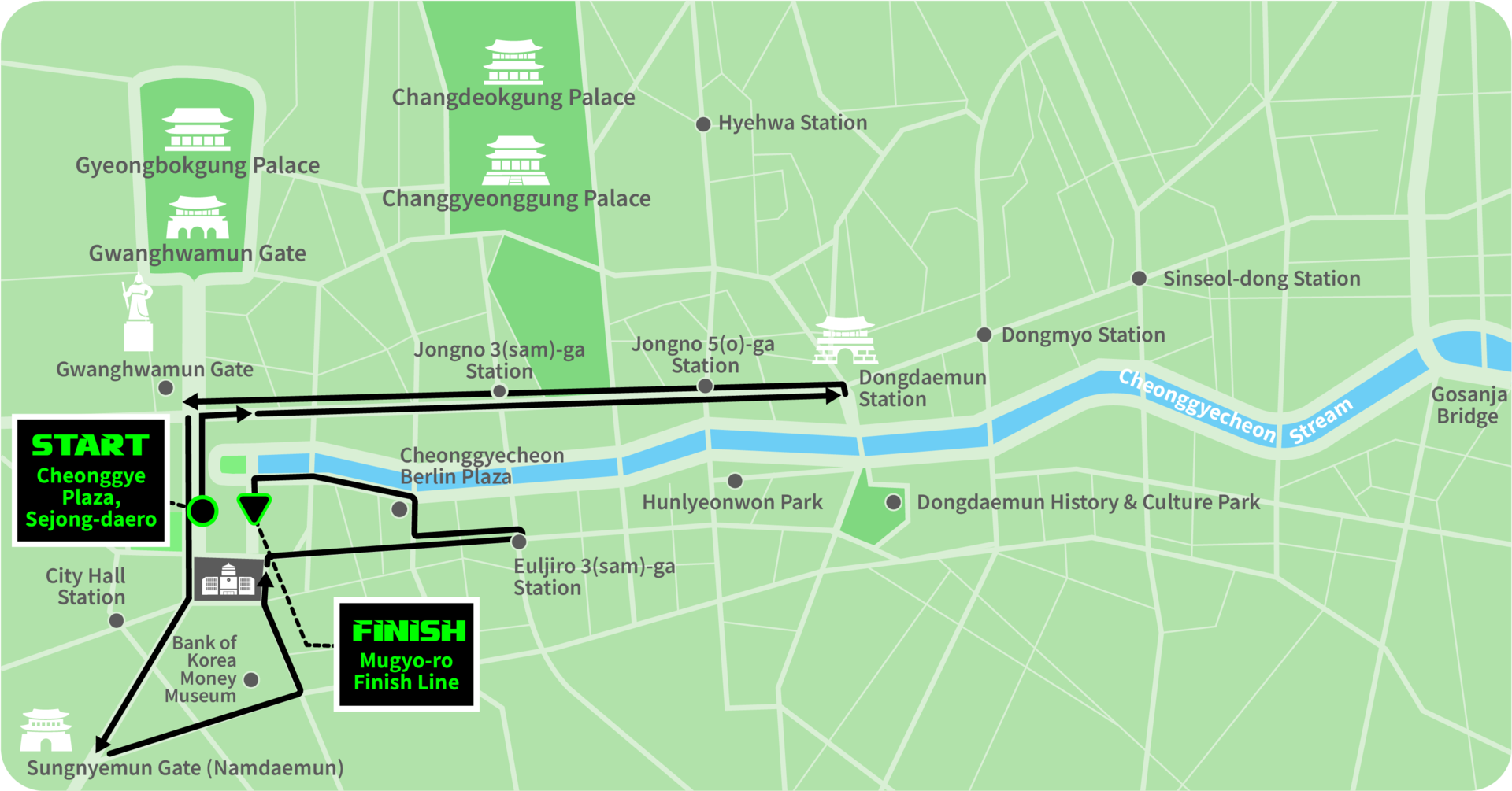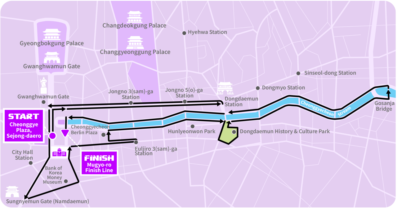 Cheonggye Plaza, Sejong-daero (START) → Jongno 1(il)-ga ~ Dongdaemun Station (Turnaround) → Sejong-daero Intersection → Sungnyemun (Namdaemun Gate) → Bank of Korea → Sicheong Samgeori (City Hall 3-Way Intersection) → Euljiro 3(sam)-ga Station (Turnaround) → Euljiro 2(i)-ga → Sam-il Bridge (South) → Cheonggye 2,3,4,5,6-ga → DDP (Dongdaemun Design Plaza) Loop → Cheonggye 7,8,9-ga Intersection (South) → Gosanja Bridge (Turnaround) → Cheonggye 9,8,7,6,5,4,3,2-ga Intersection (North) → Mugyo-dong Intersection (North) → Mugyo-ro Finish (FINISH)